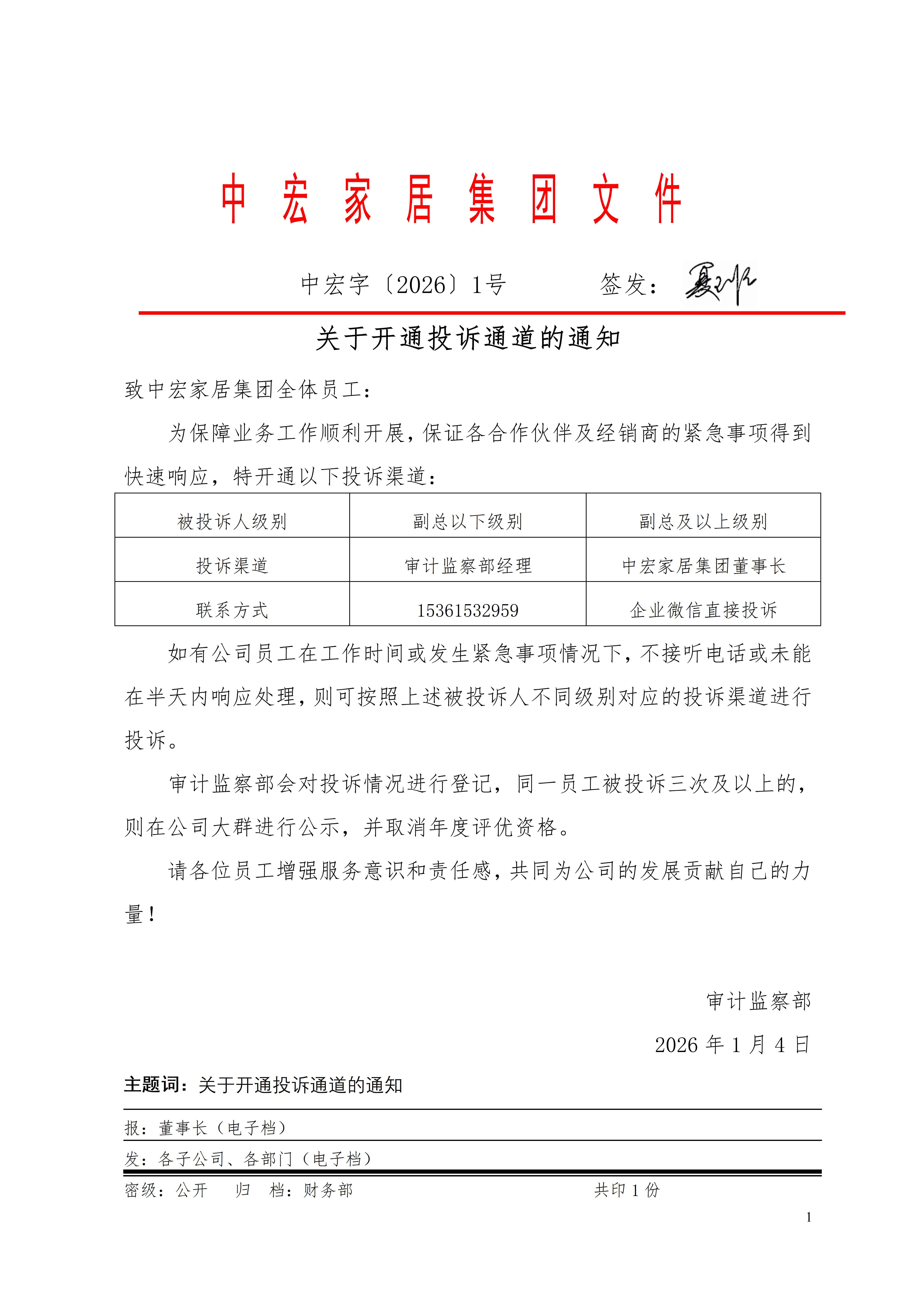 重磅!速看!中宏家居集團2026年1號文件發(fā)布《關(guān)于開通投訴通道的通知》